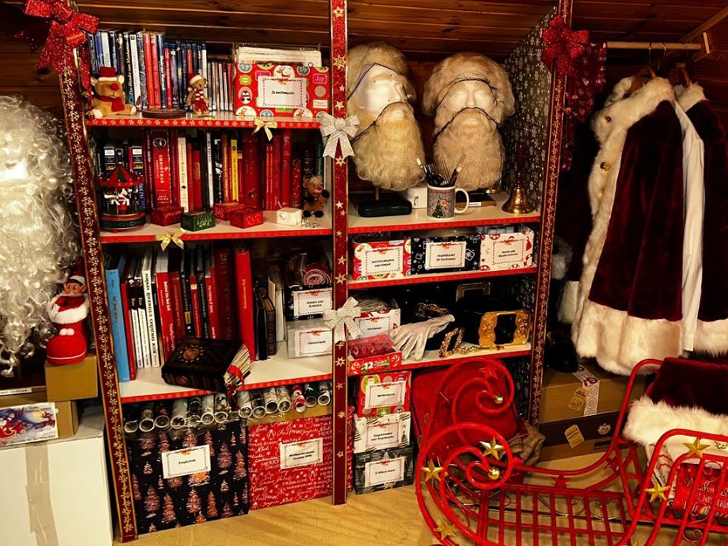 Zur ersten Planung benötigen wir deine Adresse und die Wunschzeit, zu der Santa Claus am Heiligabend kommen soll. Nach Terminbestätigung - oder falls der Termin schon vergeben ist, nach Absprache einer anderen Uhrzeit - nennst du uns weitere Wünsche, was am Heiligabend bei euch noch berücksichtigt werden soll: Z.B. - Namen und Alter des Kindes/der Kinder - Hobbys der Kinder bzw. Informationen, was das Kind/die Kinder im laufenden Jahr tolles gemacht haben - was Santa Claus sonst noch aus dem goldenen Buch vorlesen soll - Wunschzettel der Kinder (für das goldene Buch) - Ablageort, an denen Santa Claus die Geschenke finden wird usw. Wenn alle Wünsche von uns realisierbar sind, erhaltet ihr von uns die vorläufige Bestätigung hierfür und die Rechnung, die per Überweisung binnen einer Woche fällig ist. Mit Zahlungseingang bei uns gilt der Termin als verbindlich vereinbart. Wenn nach 7 Tagen noch keine Zahlungseingang bei uns zu verzeichnen ist, gilt der Termin automatisch als storniert und ist für andere Interessenten verfügbar. Eine Stornogebühr fällt hierbei nicht an. Allerdings ist eine erneute Buchung unseres Weihnachtsmannes dann nicht mehr möglich. Unser Santa Claus wird pünktlich (+/- 15 Minuten) bei euch sein und für ein besonderes Fest sorgen. Fotoaufnahmen während Santa Claus bei euch ist, sind natürlich erlaubt und ausdrücklich gewünscht. ![]() Ein Blick in Santas Kleider- und Equipmentschrank Unser Weihnachtsmann-Kostüm Besonders bei Kindern, die altersbedingt langsam an der Existenz des Weihnachtsmanns zweifeln, ist ein "echtes" Weihnachtsmann-Kostüm sehr wichtig, um den Weihnachtszauber weiter aufrecht zu halten.Unser Santa trägt natürlich keine Kunststoff-Gamaschen, sondern schwere Lederstiefel. Die Knöpfe sind 24-Karat-vergoldet und tragen jeweils zwei Namen der Rentiere des Weihnachtsmann: Dasher und Dancer, Prancer und Vixen, Comet und Cupid, Donder und Blitzen und natürlich Rudolph und Santa. Der breite und dicke Gürtel ist aus echtem Leder mit einer 24-Karat-vergoldeten Schnalle mit Weihnachtsmotiven. Die Gürtelschnalle ist selbstverständlich aus Metall und nicht aus Kunststoff. Knöpfe und Schnalle sind in Anlehnung an den wunderschönen Weihnachtsfilm "Das Wunder von Manhattan (1994)" designt. Weiße Lederhandschuhe, die Weihnachtsklingel aus Messing und der verzierte Geschenkesack aus Jute runden das Erscheinungsbild unseres Weihnachtsmannes ab. Natürlich trägt Santa keinen fizzeligen, eingefärbten Hipster-Bart, sondern einen mächtigen Rauschebart. Bis 2023 trug unser Santa Claus einen langen Kunststoffbart bzw. auf Wunsch einen Echthaarbart wie Santa in dem Weihnachtsfilm von 1994 "Das Wunder von Manhattan". Seit 2024 trägt er standardmäßig einen extra für uns gefertigten weißen Rauschebart aus aus Echthaar, nachempfunden dem von Tim Allen im Weihnachtsfilm "The Santa Clause". Natürlich besitzt Santa auch die im Film gezeigte Visitenkarte mit dem Weihnachtsmann-Vertrag.Der Echthaarbart und die ebenfalls aus Echthaar bestehende Perücke und Augenbrauen werden vor jedem Auftritt professionell geklebt. Das bedeutet, dass die jeweiligen Übergänge durch auf die Haut geklebte Einzelhaare verdeckt sind. Somit sieht Santa auch in direkter Nähe absolut echt und authentisch aus. Am Gürtel befindet sich auf der rechten Seite eine große Ledertasche, in der Santa das goldene Buch bei sich führt, in dem die guten Taten der Kinder notiert und teilweise die Wunschzettel der Kinder abgelegt sind. Auf der anderen Seite baumelt der magische Schlüssel, mit dem Santa alle Türen öffnen kann, vom Gürtel. Gemäß des amerikanischen Vorbilds trägt Santa Claus niemals eine Rute und droht auch keinen Kindern.